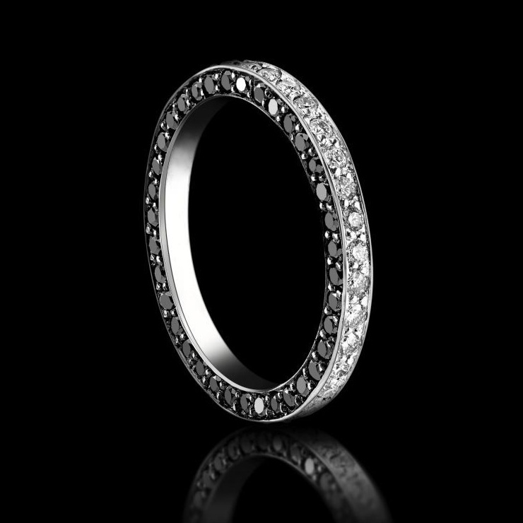 Классическое золотое кольцо с черными и белыми бриллиантами представляет собой тонкий ободок из белого золота. Верхние камни бриллианты высокого качества с хорошими характеристики, боковые камни закреплены черного цвета также высокого высокого качества. На фото драгоценные вставки размещены полностью по кругу. Для заказа доступны кольца с размещением камней на половину окружности кольца.
